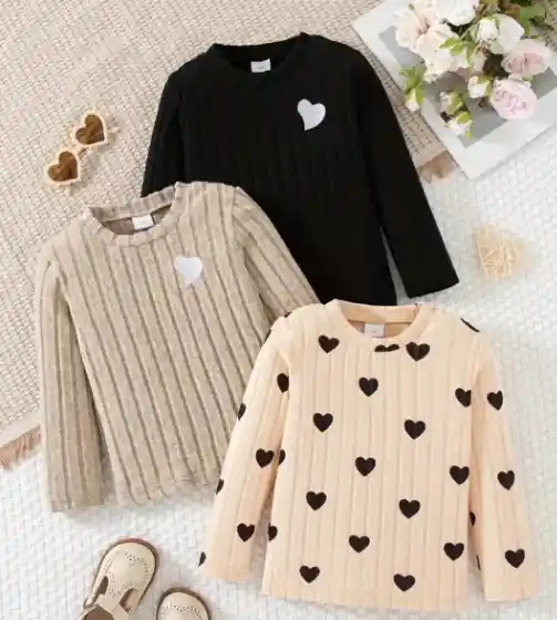 3 Camisetas Manga Larga Niña Acanalada Con Corazones 7 Años