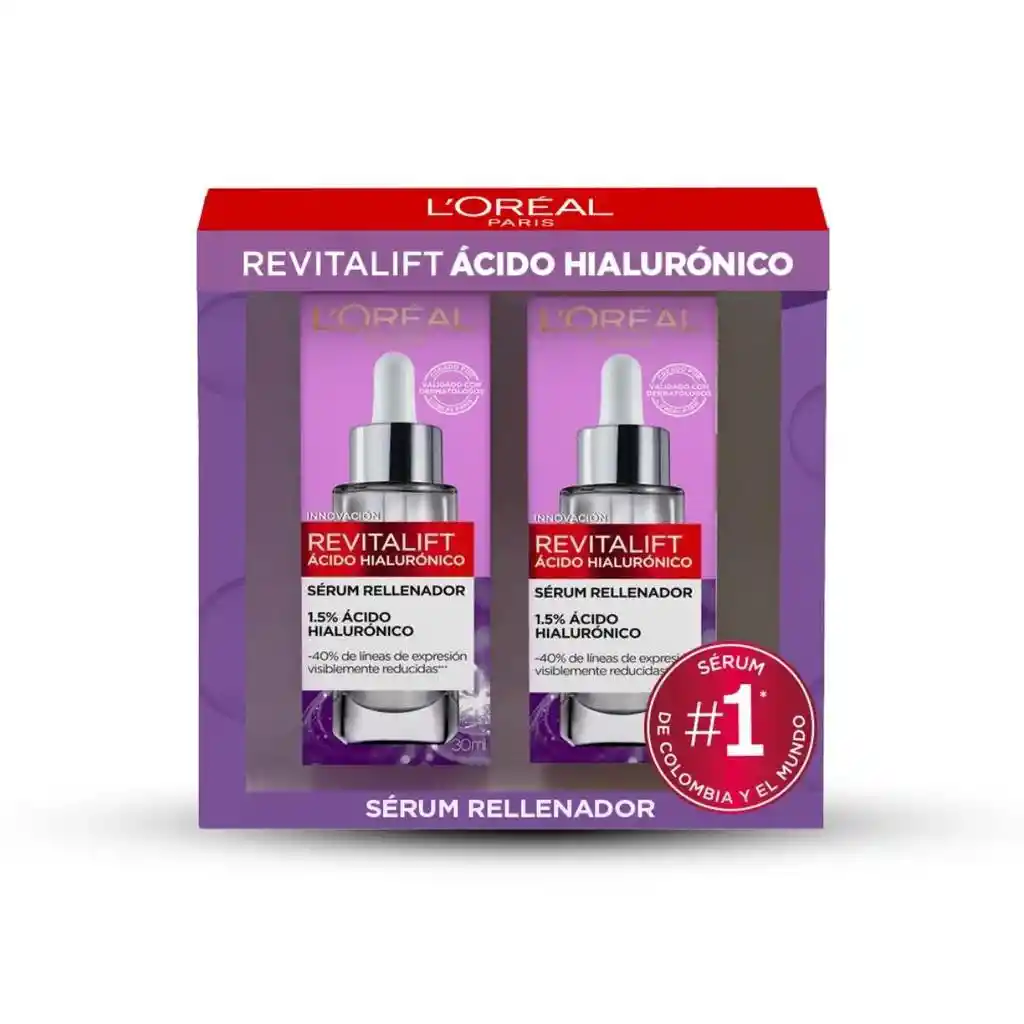 Suero facial diseñado para integrarse con facilidad en la rutina diaria de cuidado, aportando una sensación inmediata de hidratación y confort en la piel. Su fórmula con ácido hialurónico al 1.5% contribuye a mejorar visiblemente la apariencia del rostro, favoreciendo una textura más uniforme y un aspecto revitalizado con el uso constante tanto en la mañana como en la noche. Ideal para quienes buscan complementar su rutina de cuidado facial con un producto ligero y de rápida absorción, adecuado para diferentes tipos de piel y momentos del día. Información del producto: Marca L’Oréal Paris | Línea Revitalift | Tipo sérum rellenador | Contenido 2 unidades de 30 mL cada una | Concentración 1.5% ácido hialurónico | Uso diario mañana y noche | Tipo de piel todo tipo de piel | Presentación set | Beneficio hidratación profunda | Textura ligera de rápida absorción.