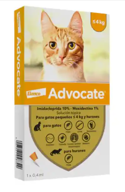 ** Se despacha 1 pipeta Advocate Gatos es usado para el tratamiento y control de las pulgas Ctenocephalides felis., tratamiento de la infestación por el ácaro del oído Otodectes cynotis, sarna Notoedrica causada por Notoedres cati, control de la infestación por el parásito del corazón Dirofilaria immitis, larva L3 y L4, tratamiento de las infestaciones por nemátodos gastrointestinales: larva L4, adultos inmaduros y adultos de Toxocara cati, Ancylostoma tubaeforme y Uncinaria stenocephala y adultos de Toxascaris leonina y Trichuris vulpis. Modo de aplicación Tópico. Solución externa. Una pipeta de Advocate Gatos tiene un efecto de 4 semanas. Transcurrido este período, debe repetirse el tratamiento, cada mes.