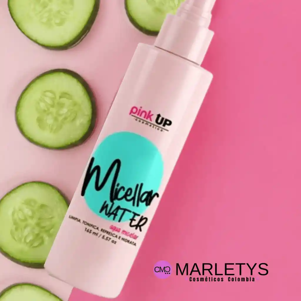 Agua Micelar Pink Up Es un producto multiusos que hace la función de: limpiar, tonificar, refrescar e hidratar la piel de tu rostro. Su secreto está en que las micelas actúan como un imán para eliminar la suciedad, exceso de grasa e impurezas sin dejar residuos en la piel. Ingredientes: Agua, nopal y pepino.