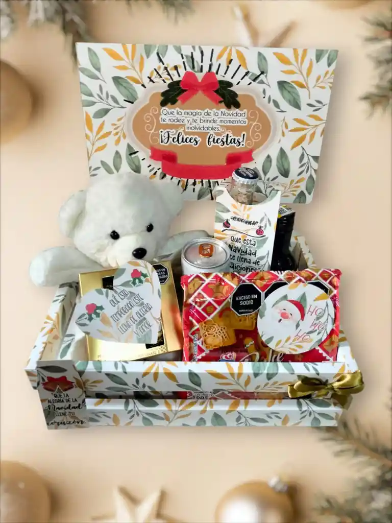 Ancheta navideña Peluche oso blanco Vino gato negro 187 ml Aperitivo Blanco Fizzy Jp Chenet 250 ml Cerveza Coronita Galletas 180g Chocolates ferrero x4.