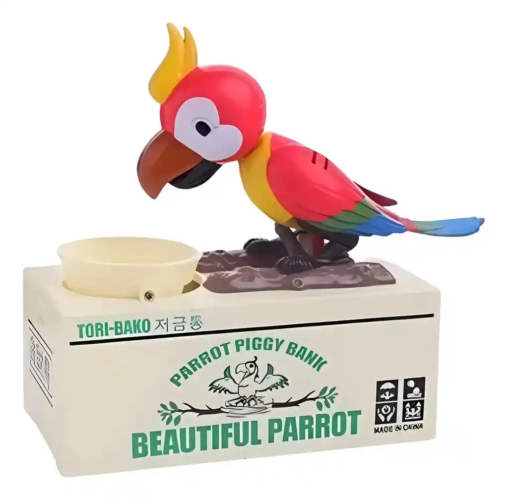 Sólo basta con poner una moneda en el plato del loro he inmediatamente el pájaro simula alimentarse hasta que se guarde la moneda. Regalo perfecto para incentivar a los niños y niñas al ahorro desde pequeños. BENEFICIOS -Una manera divertida para que tus hijos ahorren y puedan comprar sus propios juguetes, dulces o creen sus historias imaginarias mientras juegan. -Recomendado para niños de 3 años en adelante. -Gran idea para regalo, decoración del hogar o exhibición. -Divertido, práctico y muy fácil de usar a tus niños les encantara! CARACTERISTICAS -Funciona con 2 pilas AA (no incluidas) -Material: Carcasa en plástico -Tamaño Aprox.: Alcancía: 17 x 8 x 15 cm -Peso Aprox.: Alcancía: 251 g. (sin baterías) -Acepta todas los tamaño de monedas. LO QUE RECIBES CON TU COMPRA 1-Alcancía electrónica