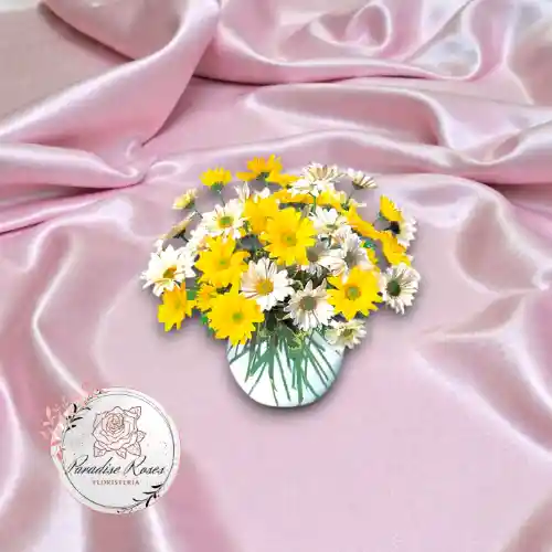 Un a bombonera de margaritas amarillas y blancas, que transmite frescura, luz y vitalidad. Ideal para llenar cualquier espacio de energía positiva. Perfecto para regalar ánimo, celebrar pequeños logros, cumpleaños o decorar hogares y oficinas