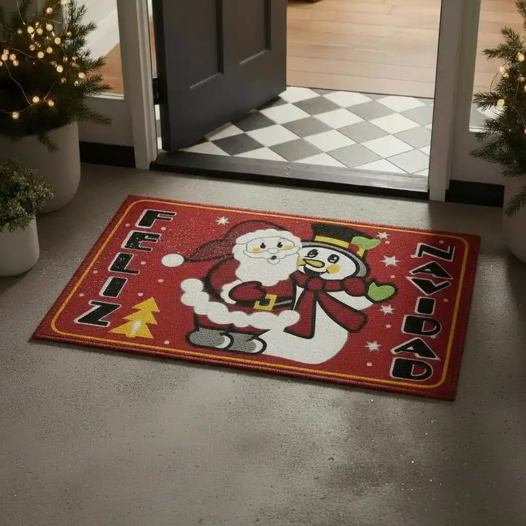 Alfombra Tapete para Puerta Decorativo Navideño Incluye: 1 alfombra navideña Material: Poliéster + base antideslizante en PVC Tamaño: 58 cm x 37,5 cm Características: - Estampados nítidos y colores vibrantes que llenan tus espacios de alegría y espíritu navideño. - Perfecta para decorar y proteger tus pisos durante la temporada decembrina. - Material ligero y resistente, fácil de limpiar y guardar al finalizar la época. - Base PVC antideslizante y bordes reforzados que brindan mayor estabilidad y durabilidad. Ideal para ubicar en: - Puerta de entrada - Cuarto de los niños - Baño - Cocina - Pasillos y zonas de paso - Decoración navideña en casa u oficina