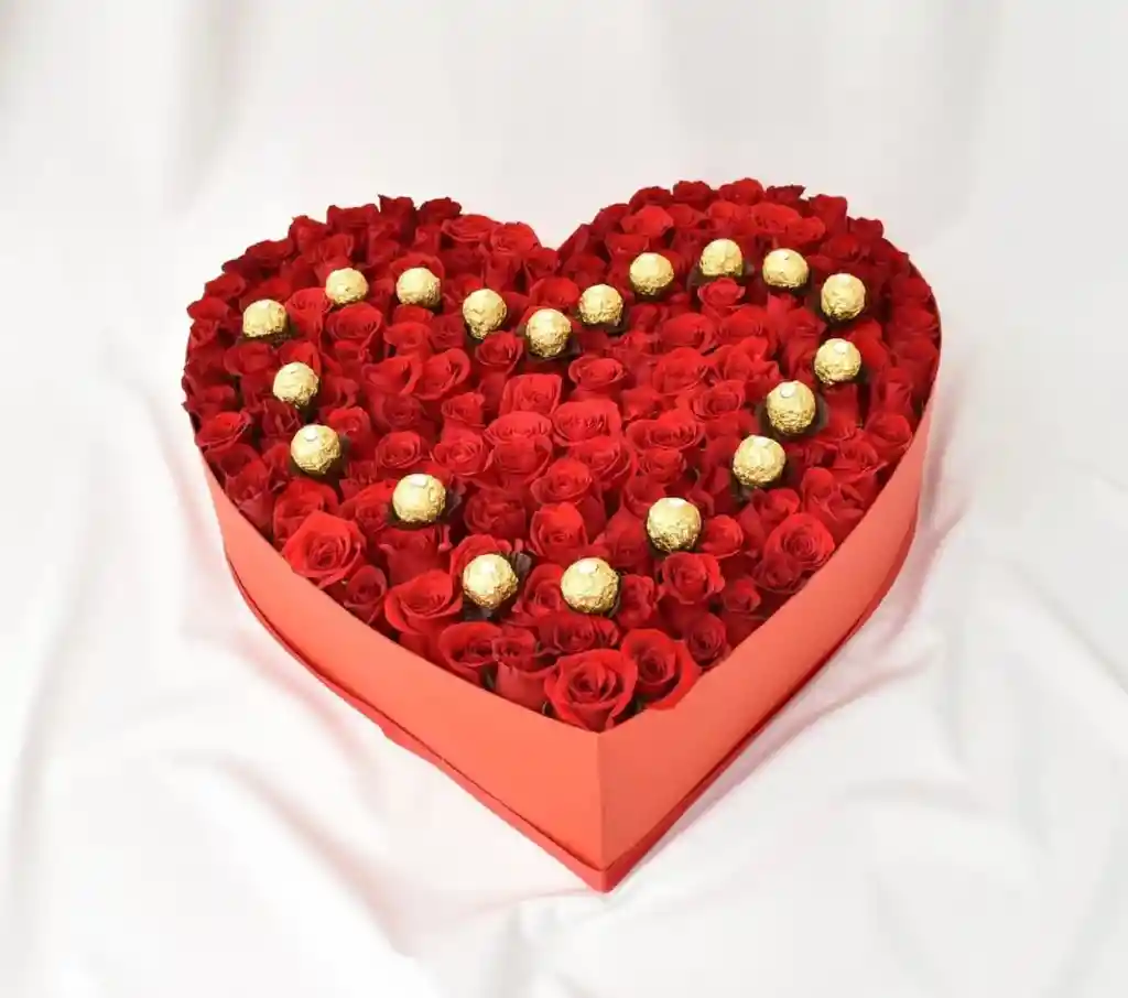 Caja en forma de corazon con aprox. 50 rosas rojas ,acompañadas de 20 chocolates. La flor puede ser sustituida dependiendo la disponibilidad de color y del producto “Mensaje Personalizado” máximo de 30 caracteres (Dejar el mensaje en el chat, los comentarios no se previsualizan para la tienda por lo que si se dejan allí no podrá ser incluido)