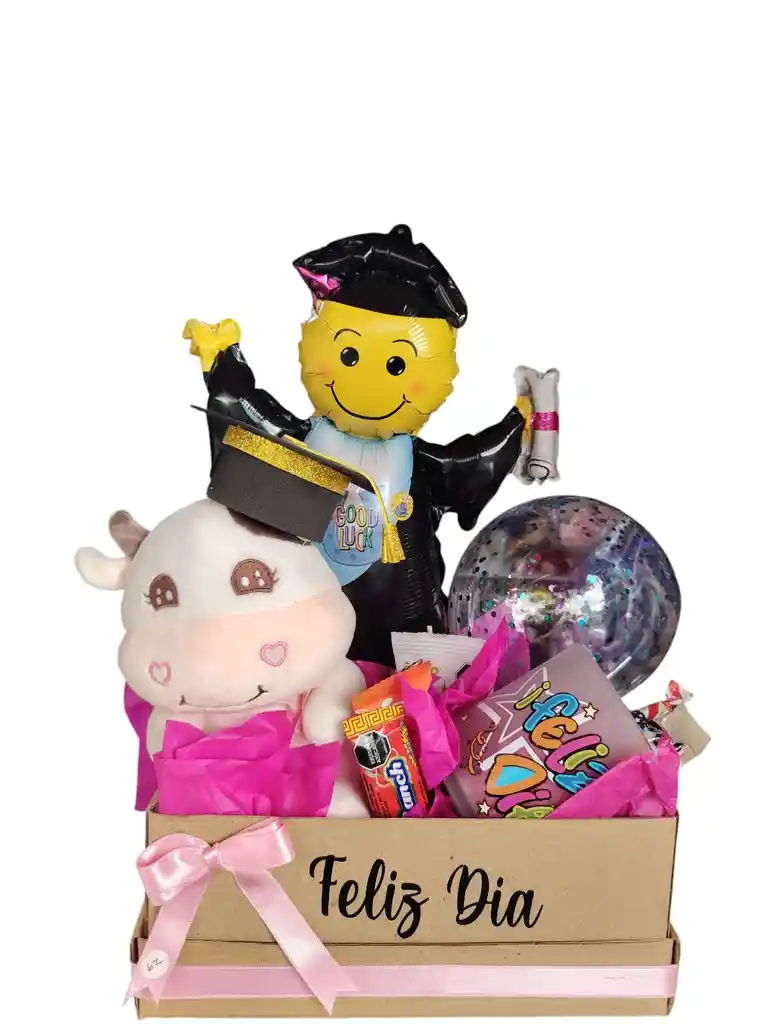 Hermnosa anchecta en caja de carton con peluche de vaquita con gorro de grado, y posillo Mug de vidrio opaslizado, 2 chocolatinas bianchi, almendras barrilete, caramelño masticabke, barquillo , globo metalizado de grado y globo transparente