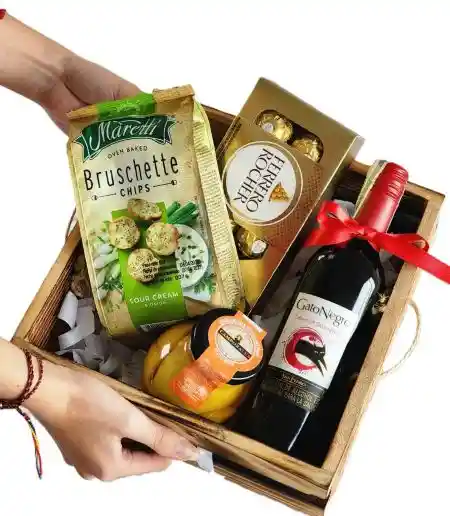 Base de Madera Vino importado Gato negro 375ml Bruchetas de 160 gr Duraznos de Almibar Caja de chocolates Ferrero Rocher 100 gr