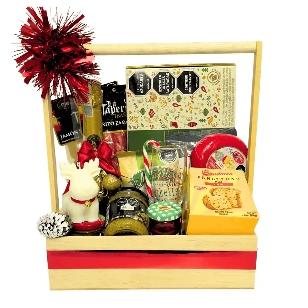 “Colección Oro” es una ancheta gourmet premium ideal para sorprender con un regalo abundante, elegante y lleno de sabor; incluye una botella JP de 750 ml 🥂, mix de jamón y queso, chorizo Zamora, galletas Moments navideñas surtido especial 🍪, bruschette crujientes, una copa 2026 brillante, un bastón de dulce 🍭, queso holandés 🧀, panettone, cerezas, salsa pesto, pistachos, duraznos en almíbar 🍑, una vela aromática en forma de reno ✨ y una base de madera decorada con tema navideño que realza la presentación con un toque sofisticado y festivo. Es una opción perfecta para clientes VIP, ejecutivos, colaboradores especiales o familias que buscan un regalo gourmet exclusivo y memorable. Te podemos obsequiar una tarjeta si nos envías el mensaje para que acompañes tu detalle.