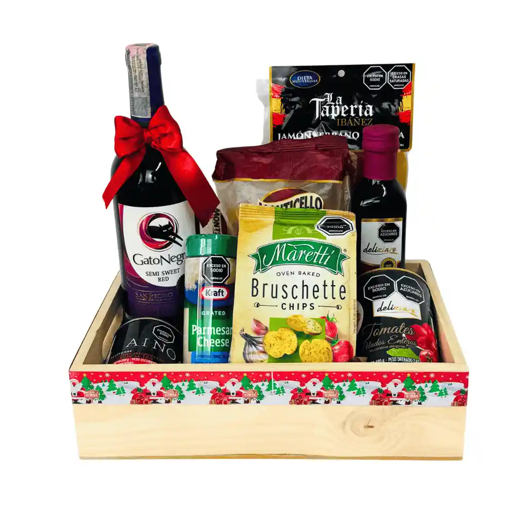 “Regalo Maestro” es una ancheta gourmet ideal para sorprender con un detalle elegante, completo y lleno de sabor; incluye una botella de vino de 750 ml 🍷, pasta Monticello 🍝, jamón serrano premium, vinagre balsámico, tomates en lata, bruschette crujientes, queso parmesano 🧀 y aceitunas, todo presentado sobre una base de madera que realza la presentación con un toque sofisticado y especial. Es una opción perfecta para clientes VIP, colaboradores, ejecutivos o familias que disfrutan los detalles gourmet con excelente presentación. Te podemos obsequiar una tarjeta si nos envías el mensaje para que acompañes tu detalle.