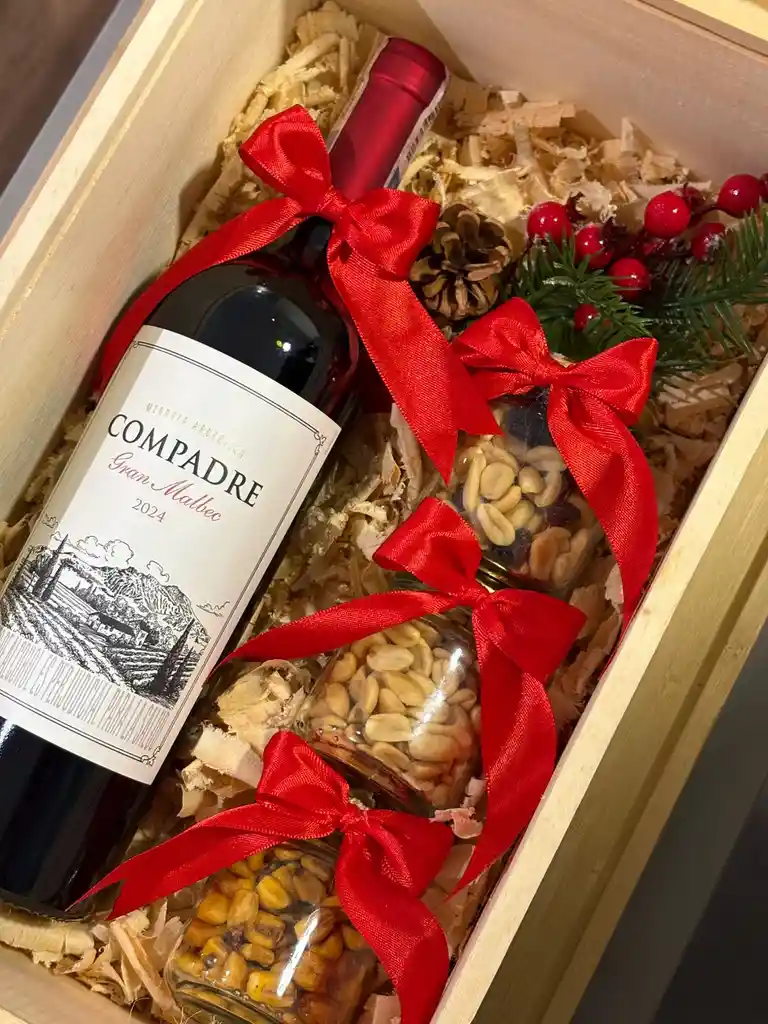Caja de madera con vino tinto entre seco y dulce, tres tipos de frutos secos, tarjeta personalizada. La caja se envía con un moño rojo. No dejes pasar navidad sin regalar amor!