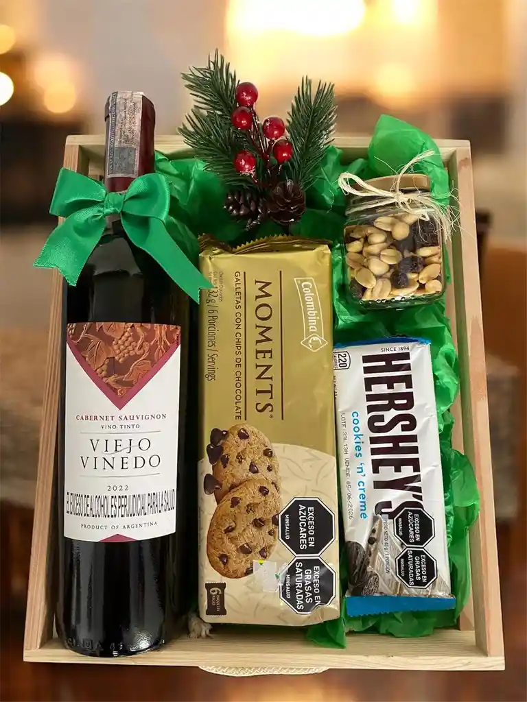 Sorprende esta Navidad con un detalle elegante y lleno de sabor. Esta ancheta incluye una botella de vino seco de 750 ml, unas finas galletas Moments con chips de chocolate, un frasco de frutos secos premium y una chocolatina blanca Hershey’s, todo presentado en una caja decorativa de madera que resalta su toque artesanal y navideño.