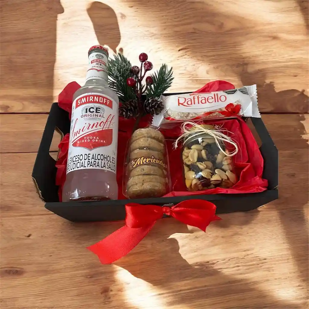 Celebra esta Navidad con un detalle elegante y lleno de sabor. Esta hermosa ancheta incluye una botella de Smirnoff, deliciosas galletas de café o vainilla, 3 finos chocolates Raffaello, y un frasco de frutos secos premium, todo presentado en una bandeja decorativa navideña lista para regalar.
