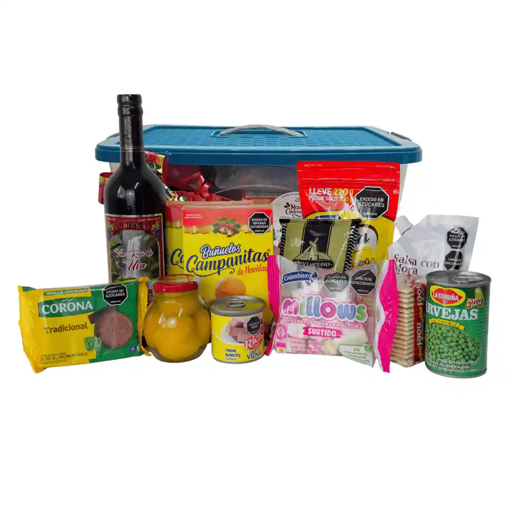 “Dulce Hogar” es una ancheta navideña familiar ideal para sorprender con un regalo completo, tradicional y lleno de sabor; incluye vino de 2.4° 🍷, natilla, buñuelos, bebida achocolatada, café molino ☕, mermelada, galletas de soda, arvejas en lata, masmelos suaves, salchichas en lata, duraznos en almíbar 🍑 y chocolate Corona, todo presentado en una caja organizadora plástica mediana con moño que realza la presentación y puede reutilizarse fácilmente. Es una opción perfecta para empresas, colaboradores, clientes o familias que buscan un detalle navideño abundante, práctico y representativo de la temporada. Te podemos obsequiar una tarjeta si nos envías el mensaje para que acompañes tu detalle.