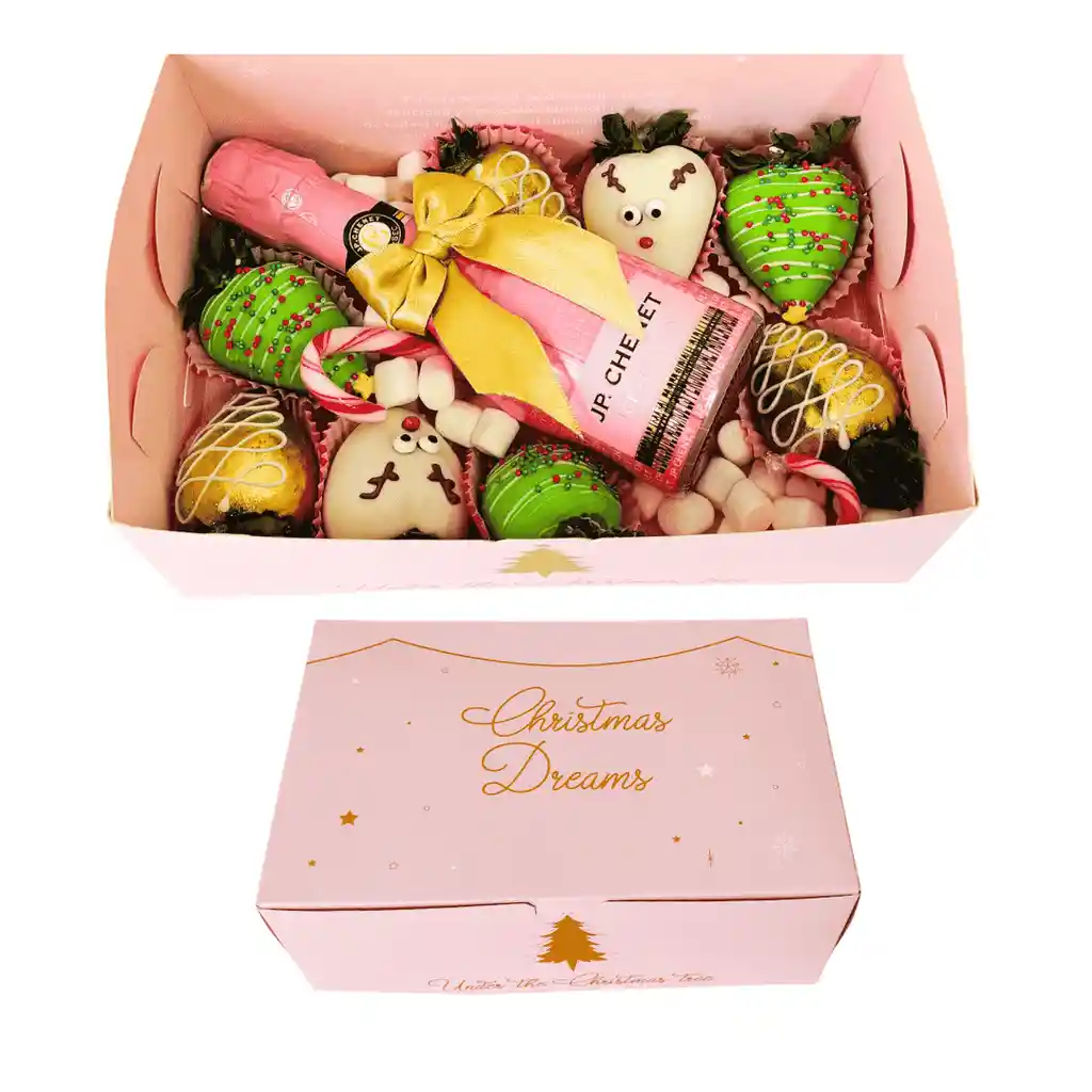 Nuestra “Fresas JP Navideñas” es una ancheta ideal para sorprender con un detalle elegante y delicioso; incluye una caja decorativa navideña 🎄, ocho fresas cubiertas con chocolate en diseños temáticos 🍓🍫, una botella JP de 200 ml 🥂, masmelos suaves y una presentación perfecta para regalar en Navidad a clientes, colaboradores, parejas o familiares. Es una opción festiva, sofisticada y muy buscada por quienes desean un regalo navideño dulce y con toque premium. Te podemos obsequiar una tarjeta si nos envías el mensaje para que acompañes tu detalle.