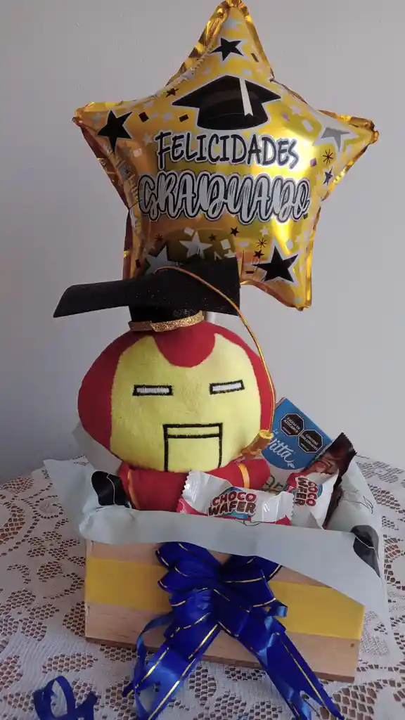 Caja en madera decorada con globo, incluye peluche a su gusto, jugo en caja, chocolatina, gelatina de dulce, 2 chocolates.