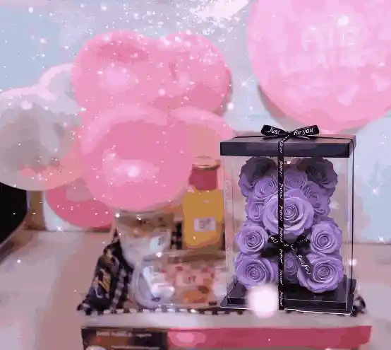 Contenido: 1 Mini Postre de Cumpleaños 1 Jugo Natural de Naranja 4 Chocolates Speciales 2 Galletas 1 Yogurt 1 Maní 1 Granola 1 Bandeja de Frutas 1 Sándwich jamón y Queso, Vegetales 1 Hermosa Decoración de Globos 1 Bandeja de Desayuno Decorada 1 Hermosa decoracion 1 Oso de Rosas morado + Ancheta