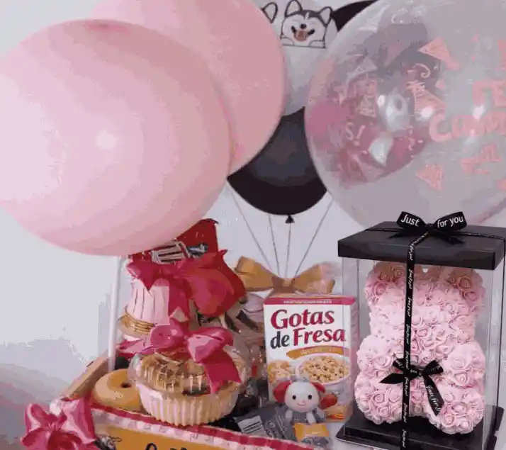 Contenido: 1 Oso de Rosas + Ancheta 1 Mini Postre 1 Mani 2 Barra de Granola 2 Galletas 8 Mini Donas 2 Manzanas 1 Chocolate Grande 1 Bandeja de Fresas