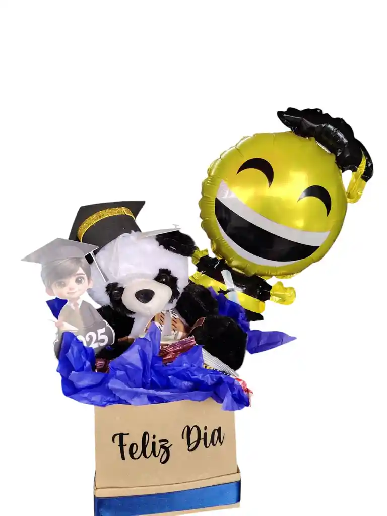 Hernosa ancheta en cajita de carton de Feliz dia, decorada con moño, contiene Peluche oso Panda con birrete y globo metalizado de grado, galletas italo waffer, chocolates bianchi, barrielte , almendras