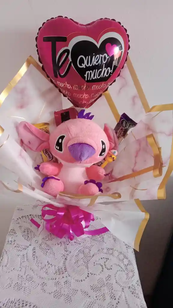 Lindo peluche en forma de ramo lleva un peluche de stich, un gol, una chocolatina, un estero , una galleta globo y decorado todo va empacado en papel jordano en forma de ramod éramos