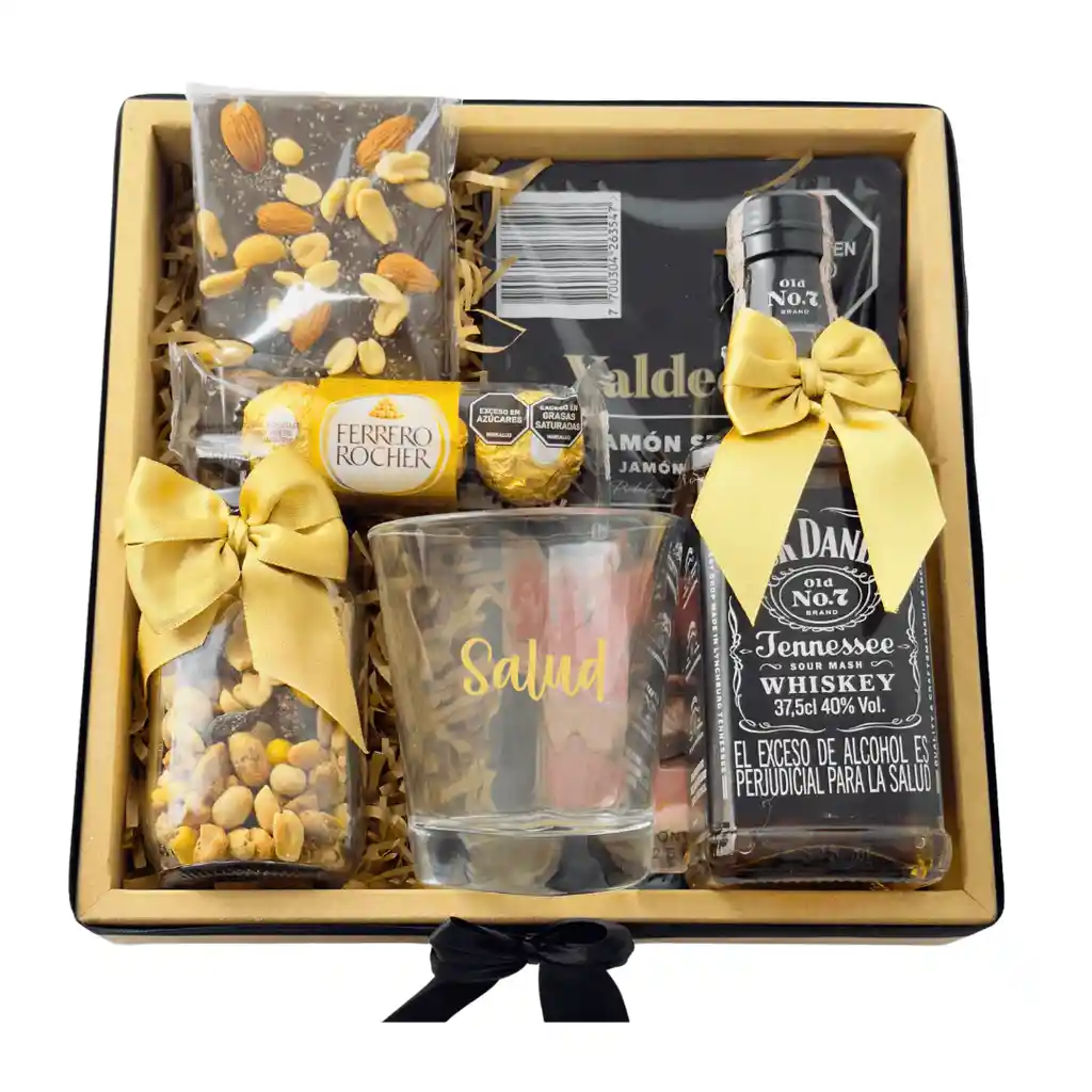 Un regalo sofisticado que combina whisky, jamón serrano y dulzura para sorprender con distinción 🥃🍫. Incluye una botella de Jack Daniel’s de 375 ml, cuatro chocolates Ferrero Rocher, jamón serrano premium, un vaso para whisky y una selección de snacks surtidos. Todo presentado en una base de madera con acabado elegante. Si nos envías tu mensaje, te obsequiamos la tarjeta personalizada para expresar tus sentimientos de manera única. REF: ANC03
