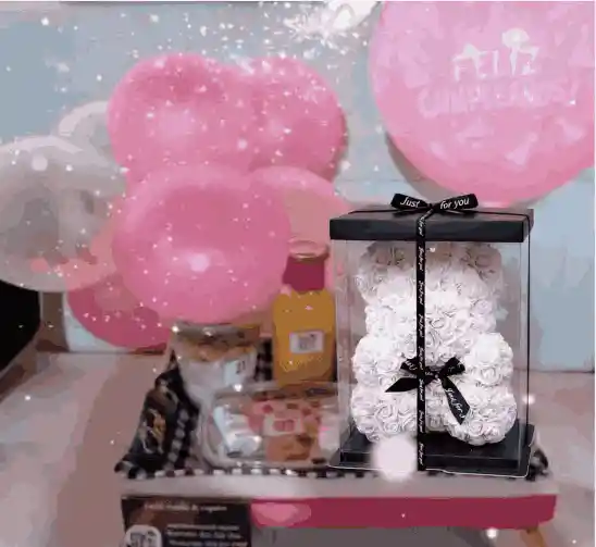 Contenido: Oso de Rosas Blanco+ Ancheta de cumpleaños 1 Mini Postre de Cumpleaños 1 Jugo Natural de Naranja 4 Chocolates Speciales 2 Galletas 1 Yogurt 1 Maní 1 Granola 1 Bandeja de Frutas 1 Sándwich jamón y Queso, Vegetales 1 Hermosa Decoración de Globos 1 Bandeja de Desayuno Decorada 1 Hermosa decoracion