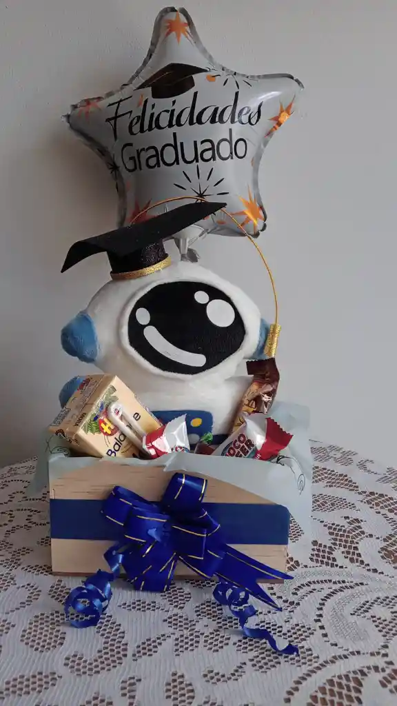 Caja en madera con peluche a su gusto, jugo en caja, chocolatina, gelatina de dulce, 2 chocolates globo y decorado
