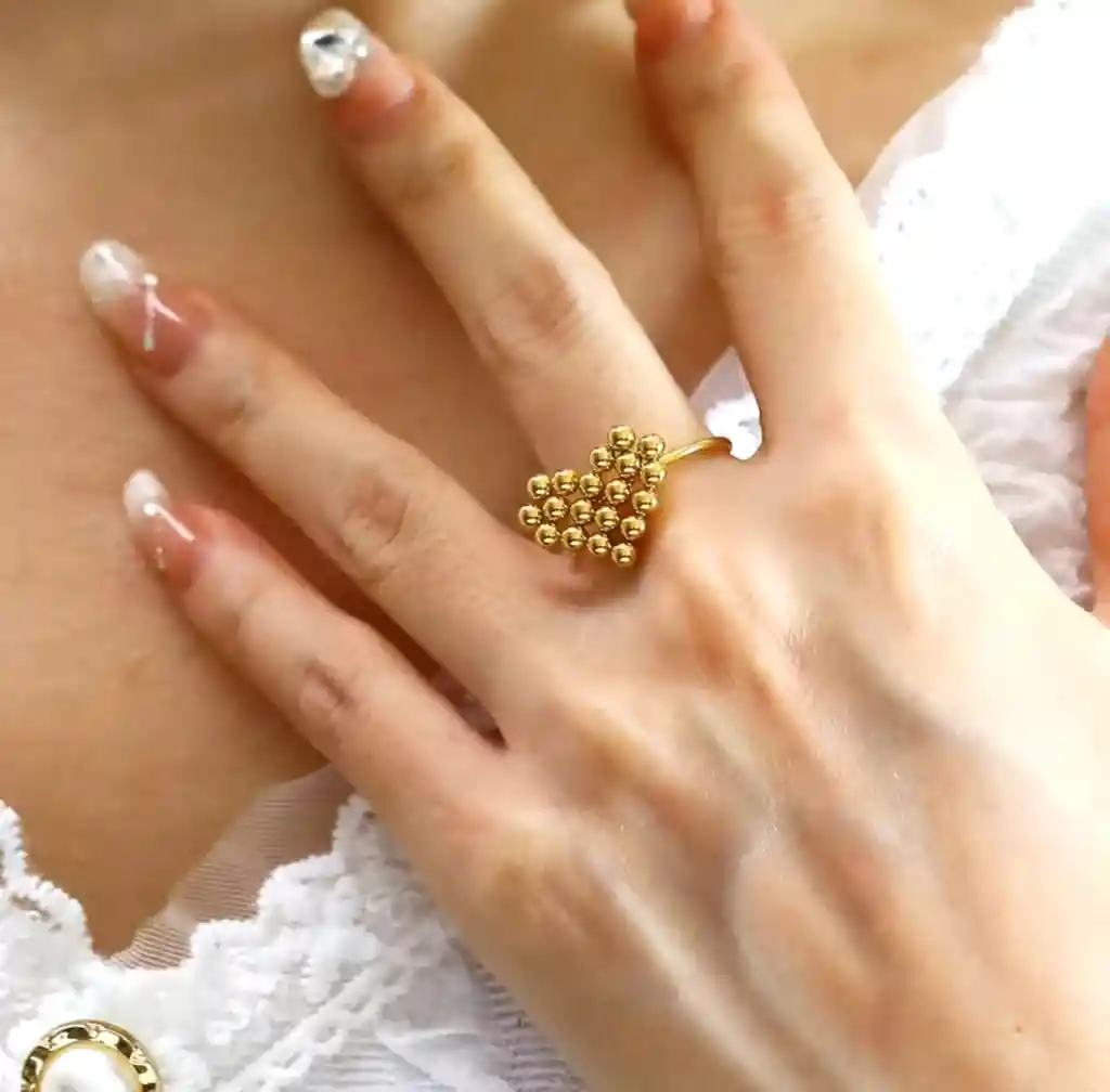 Este anillo es una joya moderna con alma artística. 💛 Elaborado en acero inoxidable con baño de oro de 18K, su diseño de pequeñas esferas entrelazadas crea una forma geométrica elegante y única. Ajustable y ligero. ✨