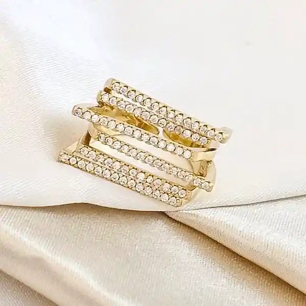 Anillo Lujo 6 Líneas con Circones Dorado en rodio, una joya elegante con brillo intenso y diseño moderno que realza cualquier look.
