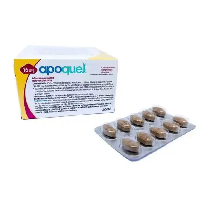 Información APOQUEL (imagen de referencia ) blíster x10 tabletas es un medicamento para el control del prurito (rascado) de origen alérgico asociado con dermatitis alérgica y para el control de los síntomas clínicos de la dermatitis atópica en perros mayores de 1 año y con un peso mínimo de 3 Kg. Es una fórmula segura, de fácil administración y que ofrece una rápida acción. Beneficios 1. Presentación en tableta masticable con agradable sabor a cerdo, lo que facilita su administración, además puede suministrarse con o sin comida. 2. Brinda alivio a partir de las primeras 4 horas y controla efectivamente el prurito (rascado) en 24 horas. 3. Seguro a corto y largo plazo, sin efectos secundarios y puede ser usado en combinación con otros medicamentos de uso diario.
