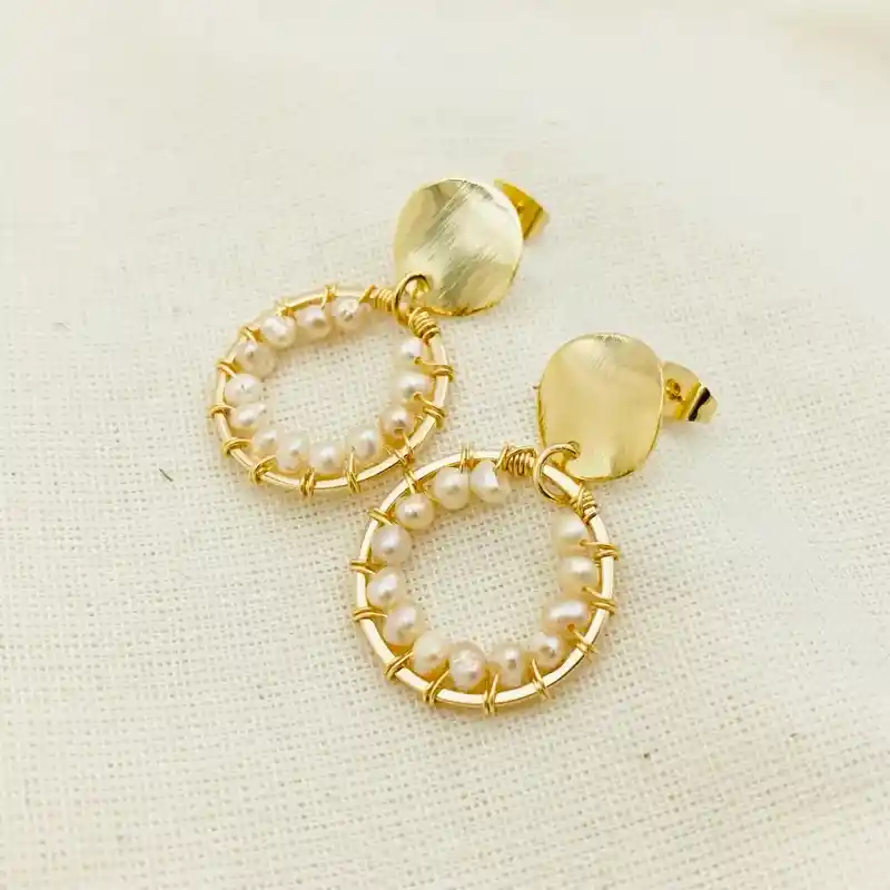 Aretes de la marca Caroco: ¨Girasol Blanco¨. Son un círculo mediano y disco con textura dorados, entochado a mano con perlas mini. Los aretes miden 3cm. de largo total. Se entrega empacado para regalo. Material: bronce bañado en oro de 18k. Producto con garantía por fallas de fabricación. Recomendaciones de cuidado: Mantén tus joyas separadas unas de otras para evitar que se enreden y se rayen. Evita el uso de forma de directa de químicos como perfumes, cremas y productos de limpieza. Guarda tus accesorios limpios en un lugar seco y lejos del sol y la humedad.
