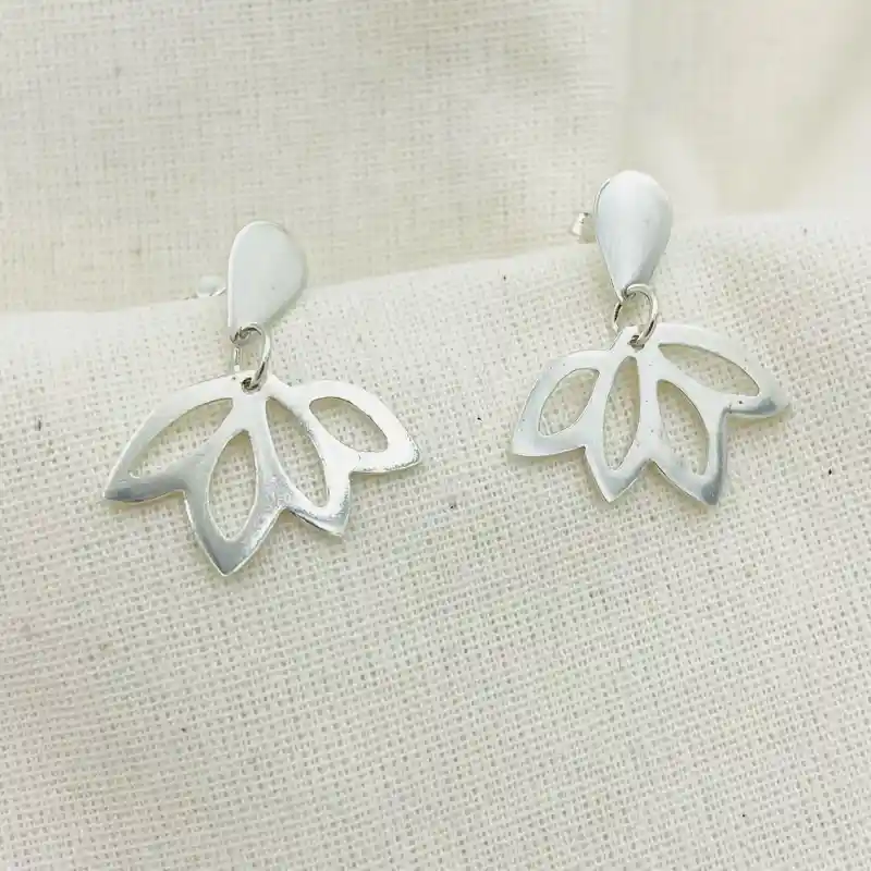 Aretes hojas de Abutilón colgando de una pequeña gota invertida, los aretes son de plata 950. El largo total de los aretes es de 3,6cm.