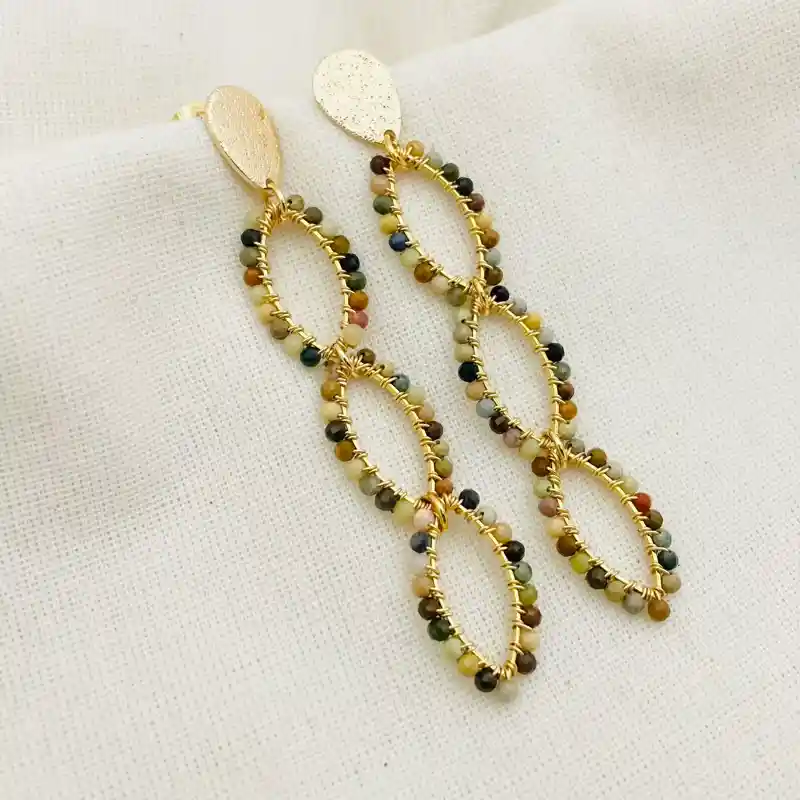 Aretes diseño ¨Jacinta Tierra¨, son 3 ojitos dorados entorchados con un mix de piedras Ágata miniatura en tonos tierra. Los aretes miden 7,5cm. de largo total. Baño de oro.