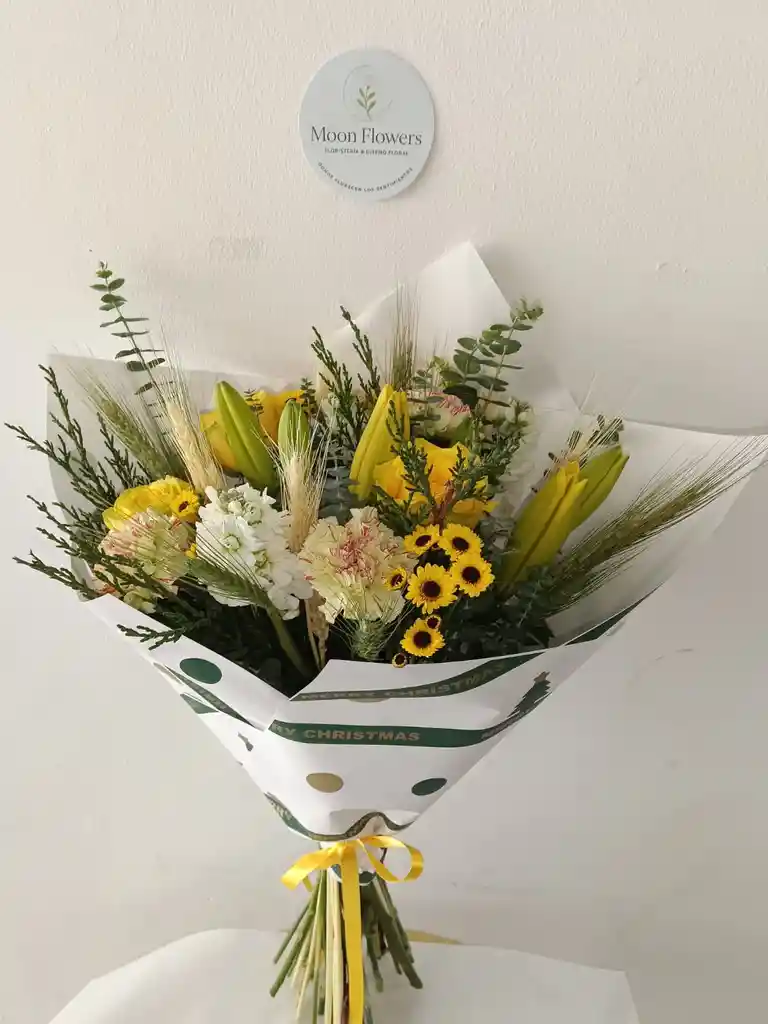 Arreglo floral sofisticado y lleno de vida, compuesto por flores amarillas vibrantes, delicadas flores blancas y follajes verdes que aportan frescura y textura.
