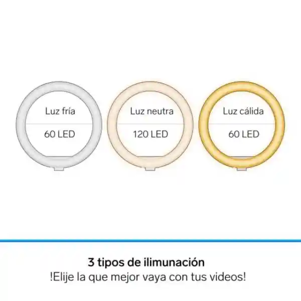 ¡Graba videos como un influencer profesional! - Ideal para Instagram*, TikTok* o YouTube* - Iluminación LED fría, neutra o cálida - Ajuste de brillo en 10 niveles - Diámetro total de 26 cm - Soporte para celular con cuello flexible de 10 cm - Soporte para celulares de hasta 9,5 cm de ancho - Base para atornillar a algún tripié - Conexión USB con cable de 1,8 m - Incorpora control multifunción