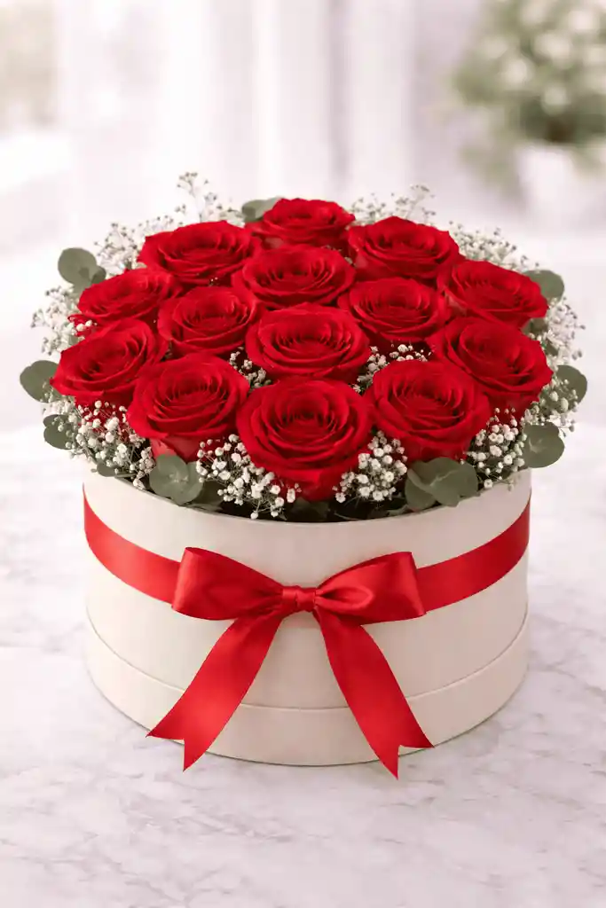 Un detalle que enamora a primera vista ❤️🌹 Elegante arreglo floral compuesto por rosas rojas naturales cuidadosamente seleccionadas, dispuestas en una sofisticada caja tipo sombrerera en tono crema, decorada con un delicado lazo satinado rojo. Acompañado con finos toques de follaje y flores complementarias que realzan su belleza y volumen. Perfecto para expresar amor, pasión y admiración en ocasiones especiales como aniversarios, cumpleaños o fechas románticas. ✨ Incluye: Rosas rojas frescas de alta calidad Follaje decorativo y flores de relleno Caja premium reutilizable Lazo decorativo elegante Un regalo clásico, intenso y lleno de significado que nunca pasa de moda. 🌹