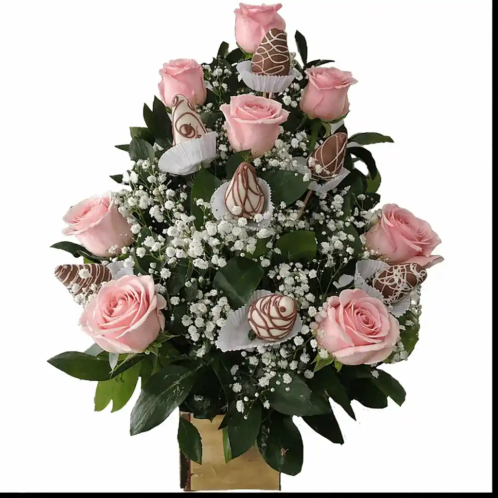 Base de Madera Con 9 Rosas Rosadas y 7 Fresas Achocolatadas Con Follaje Variado