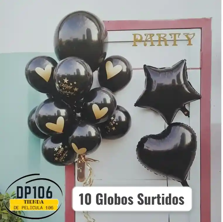 combo de 10 globos marcados R12, 2 Globos de aluminio (corazon y estrella), 1 globo negro R18. y rollo de sati...Ver más