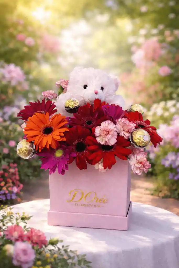 Encantador arreglo floral en elegante caja, elaborado con vibrantes gerberas de colores, delicados claveles de relleno y acompañado de 4 exquisitos chocolates Ferrero Rocher. Incluye un tierno oso de peluche que le da un toque aún más especial y significativo. Su diseño combina dulzura, color y elegancia, convirtiéndolo en el regalo perfecto para cumpleaños, aniversarios, graduaciones o cualquier ocasión en la que quieras sorprender y alegrar el día de alguien especial. 💝✨ Un detalle completo que expresa amor, ternura y felicidad en un solo regalo.