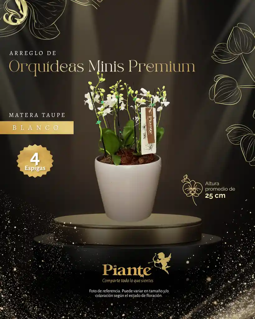 Un detalle con estilo para San Valentín: este arreglo de orquídeas mini combina elegancia y buen gusto, ideal para ambientar salas, oficinas o escritorios con un toque natural y sofisticado. Es un regalo que destaca sin exagerar, transmite intención y sorprende por su belleza, calidad y duración. Es un arreglo de orquídeas en sustrato de coco PIANTE con 4 espigas florales, con altura promedio de 25 cm y duración estimada de 3 a 4 meses según cuidados (son plantas vivas). Incluye nota de cuidados y dedicatoria personalizada, perfecto para una experiencia completa. Matera en cerámica tipo importación, diámetro 18 cm, color taupe. Foto de referencia. Puede variar en tamaño y/o coloración según el estado de floración."