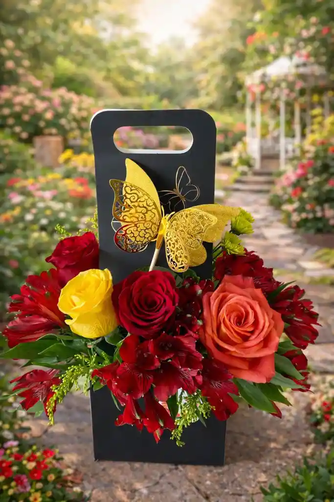 Un detalle elegante y lleno de vida, perfecto para regalar en cualquier ocasión especial 💜✨ Este hermoso arreglo floral viene presentado en una caja decorativa color morado con diseño de mariposas, que le da un toque sofisticado y delicado. 💐 Incluye: 🌹 4 rosas frescas 🌺 Astromelias (alstroemerias) en tonos vibrantes Follaje verde decorativo Mariposas decorativas que realzan la presentación Caja tipo bolso resistente y lista para regalar. El diseño y color de la caja puede variar según disponibilidad.