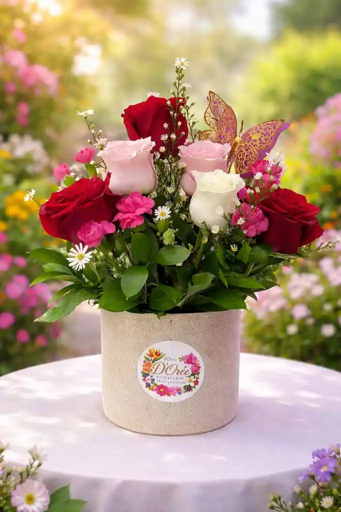 Un diseño elegante y lleno de armonía, ideal para sorprender con un detalle delicado y especial. Este hermoso arreglo incluye: 🌹 12 rosas frescas en tonos variados que transmiten amor y dulzura 🌺 Claveles que aportan volumen y un toque romántico 🌿 Follaje verde y blanco que resalta la frescura y naturalidad del arreglo 🦋 Mariposas decorativas que añaden un estilo encantador y sofisticado Presentado en una fina caja redonda, este arreglo es perfecto para cumpleaños, aniversarios, agradecimientos o cualquier ocasión especial. 💝 💌 Un detalle lleno de vida, color y elegancia que hará sonreír a quien lo reciba. El color de la Caja y las flores utilizadas para este arreglo puede variar según disponibilidad.