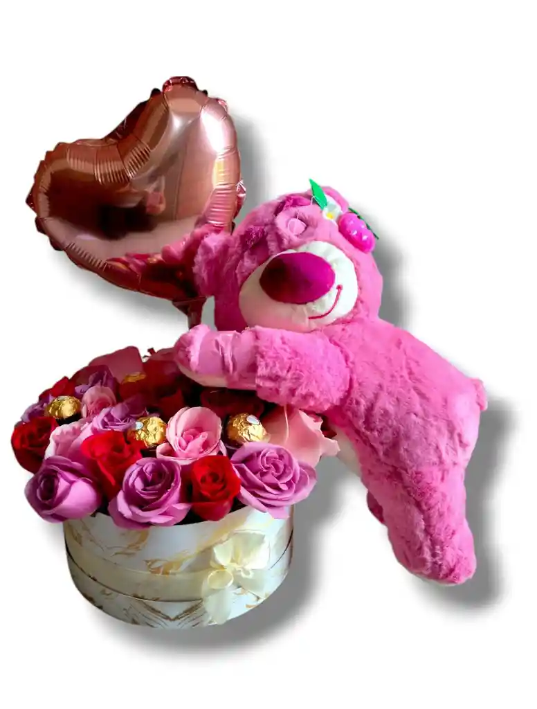 Arreglo floral de 24 rosas pastel 5 chocolates ferrero peluche y globo.