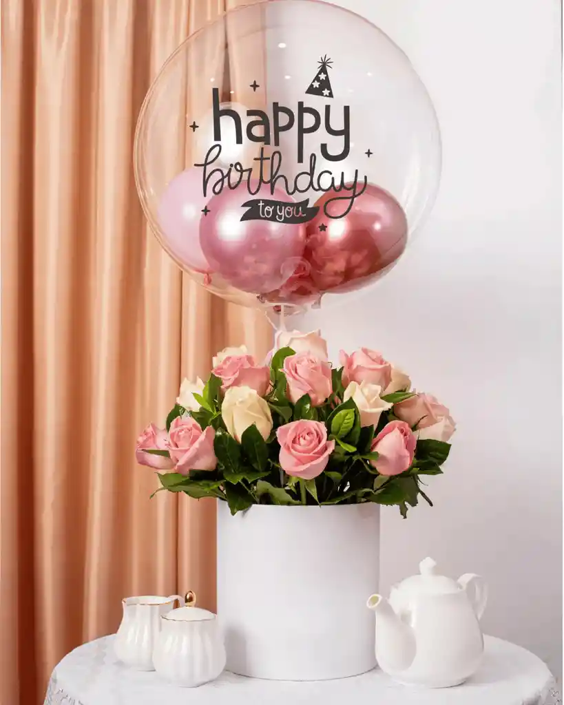 Sorprende a esa persona especial con las más bonitas flores, acompañado con un globo de cumpleaños perfecto para celebrar. ¡Aprovecha y envíalos a tus amigos, familiares o a esa persona especial solo porque sí! Especificaciones del Arreglo Happy Birthday 24 rosas en tonos rosados Elegante caja Undetalle blanco 20 x 20 cm Globo burbuja “Happy Birthday to you” Tarjeta de regalo en la que podrás dedicarle unas bellas palabras.
