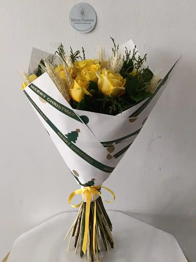 Aurora Dorada es un arreglo sofisticado compuesto por rosas amarillas de tallo largo, acompañadas de follajes verdes y delicados detalles naturales que aportan textura y armonía. Su envoltura blanca con detalles festivos y lazo amarillo resaltan un diseño luminoso y elegante.