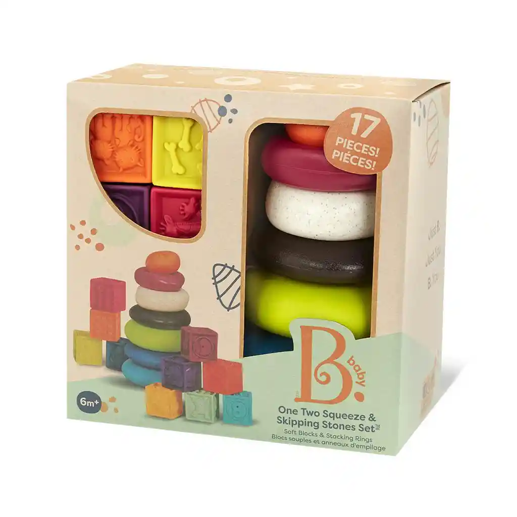 El set de juego con bloques y aros apilables estimula el desarrollo sensorial, la coordinación y la motricidad fina en bebés a partir de los 6 meses. Combina bloques suaves y aros apilables fabricados con materiales flexibles y seguros, ideales para manos pequeñas que exploran, presionan y construyen de forma intuitiva. Sus texturas variadas invitan al tacto, fomentando el reconocimiento sensorial mientras el bebé interactúa libremente con cada pieza. Información del producto Set de juego educativo para bebé | Contenido: bloques suaves + aros apilables | Número de piezas: 17 piezas | Edad recomendada: 6 meses en adelante | Funciones: apilar, apretar, construir y explorar | Beneficios: desarrollo sensorial, motricidad fina, coordinación mano-ojo y aprendizaje temprano | Materiales de fabricación: 73% acrilonitrilo butadieno estireno y 27% cartón