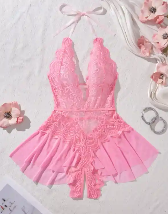 Talla M/L, la tela es elástica. Modelo 5. Babydoll sexy con abertura en la entrepierna, de encaje. Lencería Sexy. Encaje suave detalles en tela. Color Rosa. Diseño romántico con detalles de encaje, ropa de dormir romántica | Tela de encaje | Tela de poliéster.