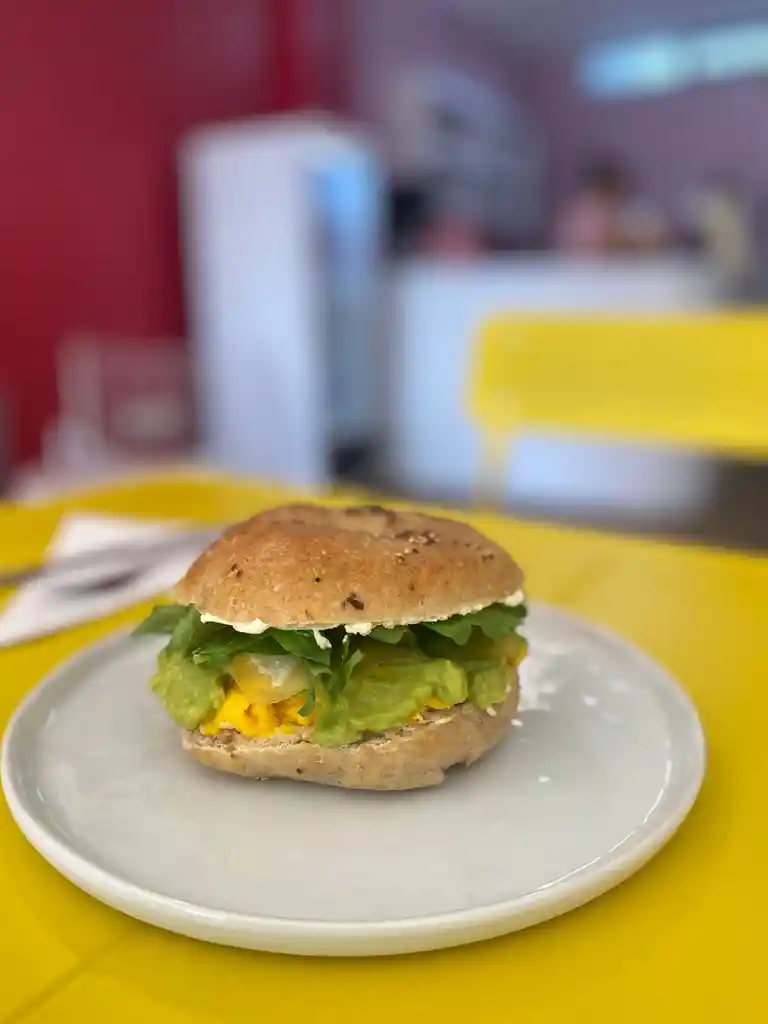 Bagel artesanal de masa madre, relleno con huevos revueltos cremosos, jamón, queso crema y aguacate fresco. Una opción equilibrada y deliciosa, perfecta para cualquier momento del día. Ideal para desayuno o brunch. Preparado al momento