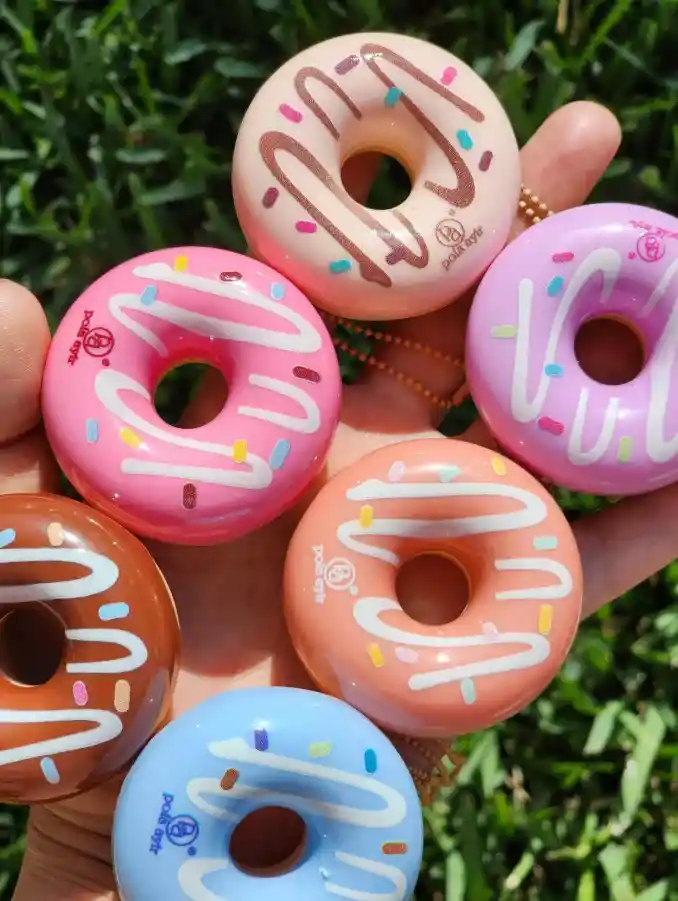 bálsamo labial hidratante que se presenta en forma de dona y tiene una cadena para llevarlo fácilmente