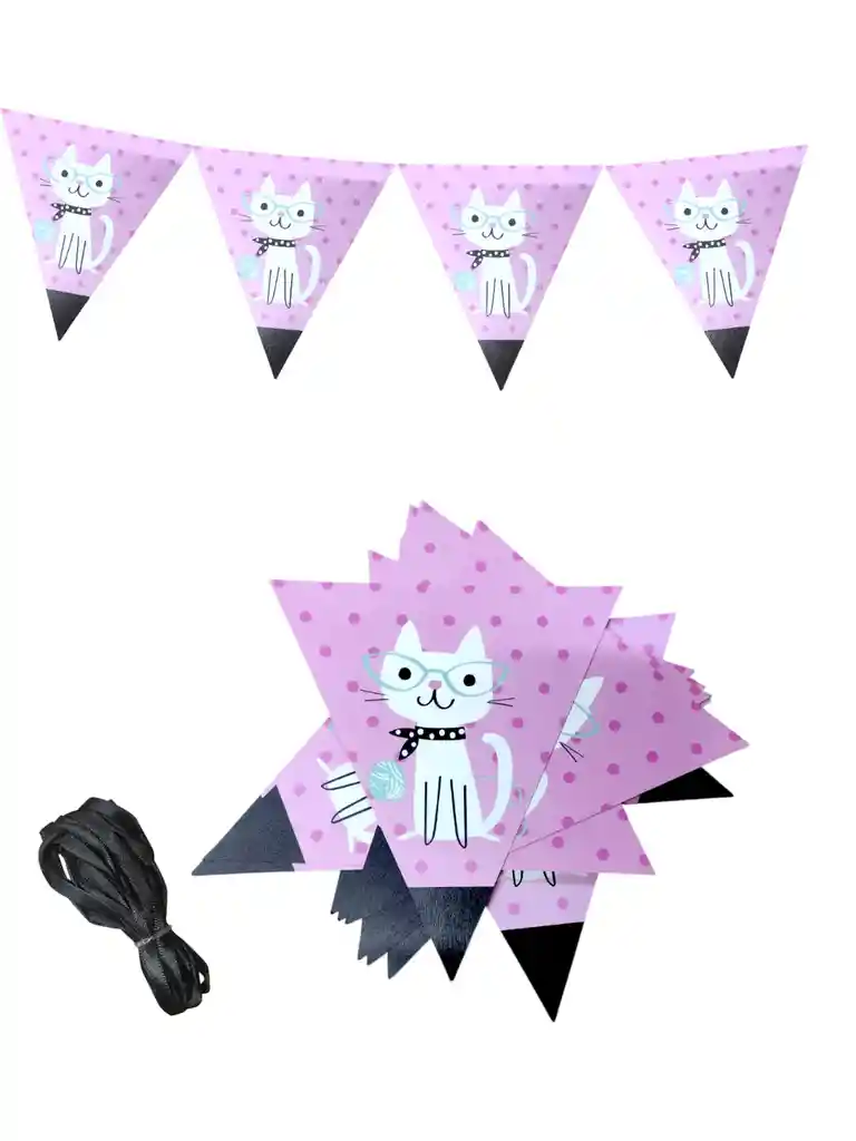 banderin para fiestas cumpleaños decoraciones eventos y mucho mas colores rosado material de carton incluye cuerda para colgar son 12 piezas cada una mide largo 14.5x16 cm forma de triangulo con fondo de gatita largo aproximado del banderin 2 metros hermoso diseño para tu fiesta si deseas algo adicional indicanos y con gusto le colaboramos