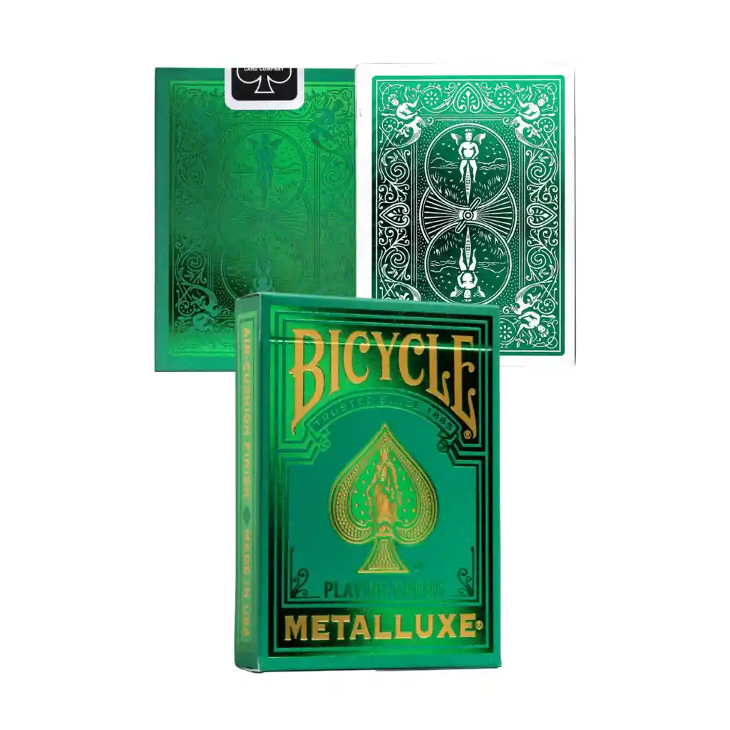 Bicycle Metalluxe Baraja Bicycle de 54 cartas especiales de doble cara sin dorsos. Las barajas Bicycle están impresas por la prestigiosa U.S. Playing Card Company. Sus estándares de calidad son muy elevados se caracterizan por su papel especial con textura de lienzo que forma un cojín de aire entre las cartas para obtener extensiones y abanicos perfectos y sus acabados en barniz satinado que alargarán la vida de tus cartas manteniéndolas siempre como el primer día. Gracias a su precio y a su gran calidad son ideales para la cartomagia por eso se las conoce como las barajas de mago por excelencia. Con una gran variedad de diseños y estilos Características: Altura: 9.0 cm Ancho: 6.5 cm ¡Cartas Bicycle, el mejor pasatiempo!
